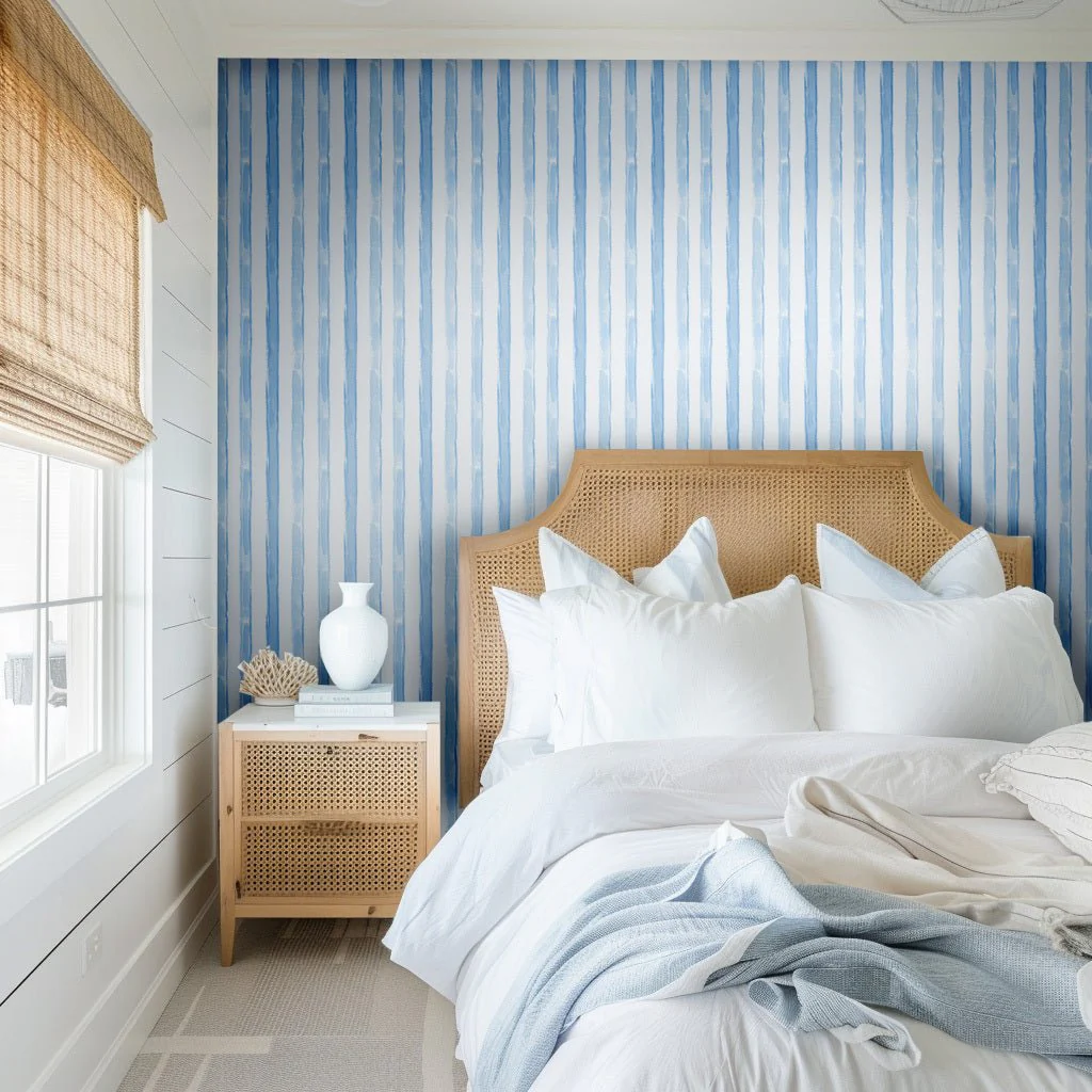 Brooke is a clean white backdrop accentuated by vertical light blue watercolor stripes, lending a modern aesthetic to any space.