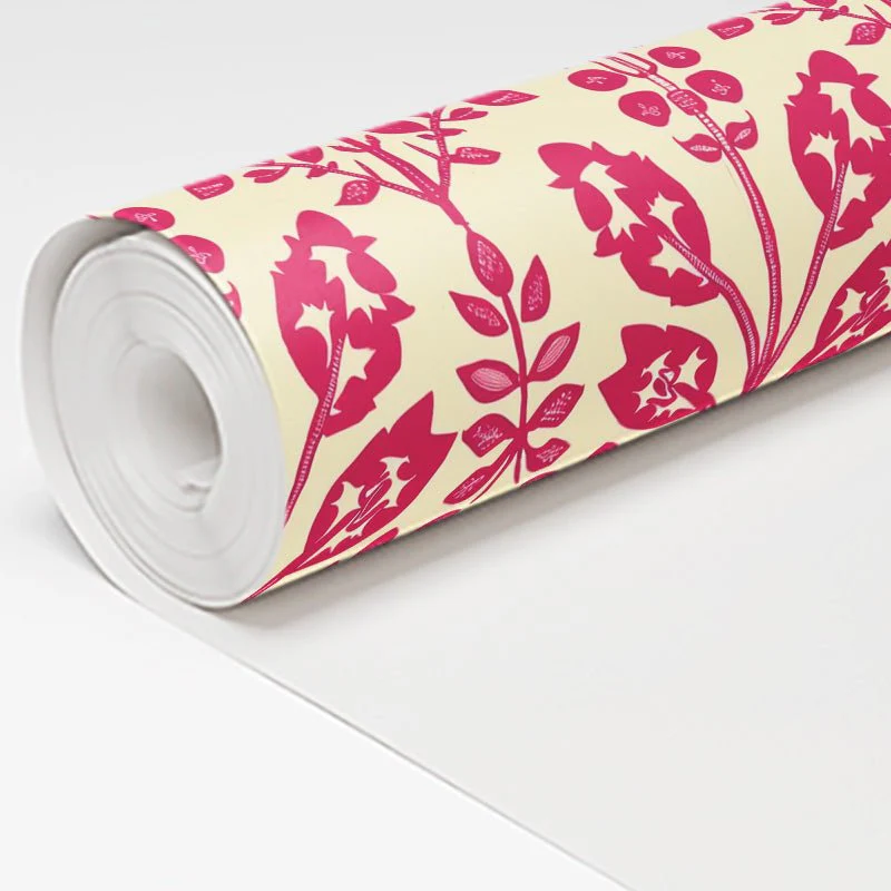 A bold and dynamic folk-inspired floral with deep magenta vines and blossoms against a warm neutral background. The intricate detailing and symmetrical design create a striking blend of tradition and modern sophistication, ideal for statement-making interiors.