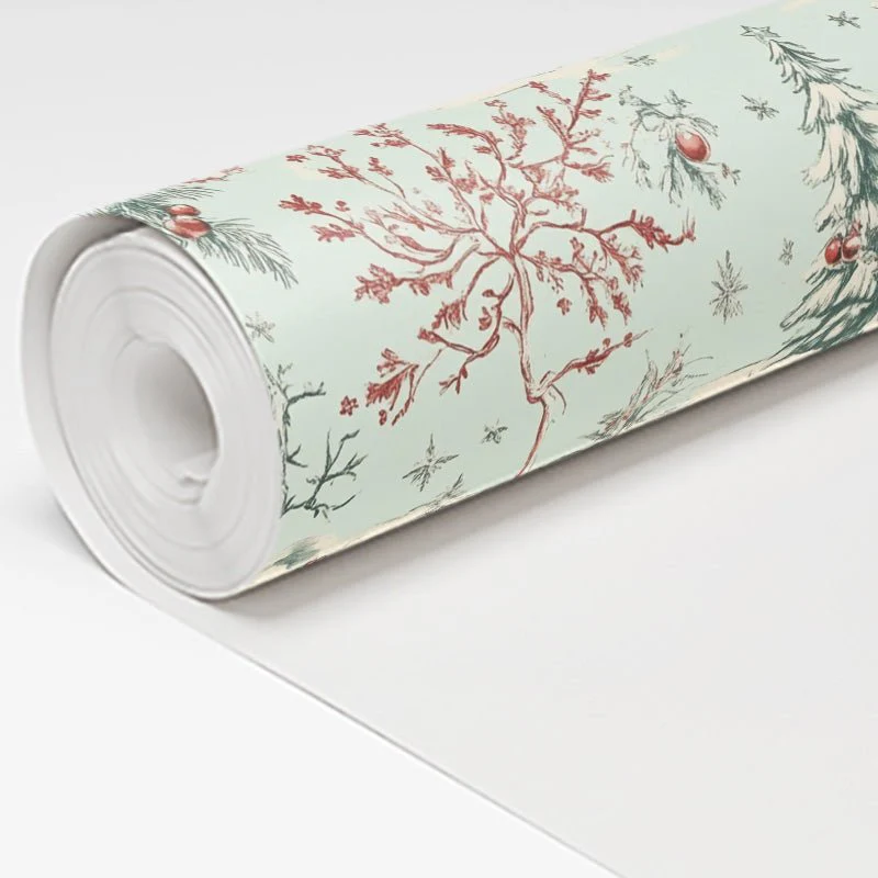 Timeless Tidings wallpaper captures the charm of a serene winter wonderland with delicate sketches of snowy landscapes, evergreen trees, and festive details. Its soft palette of mint and red creates an elegant holiday ambiance, perfect for adding a cozy and nostalgic touch to your space.